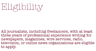 The fellowship is open to journalists everywhere, but fluency in reading and writing in English is required.